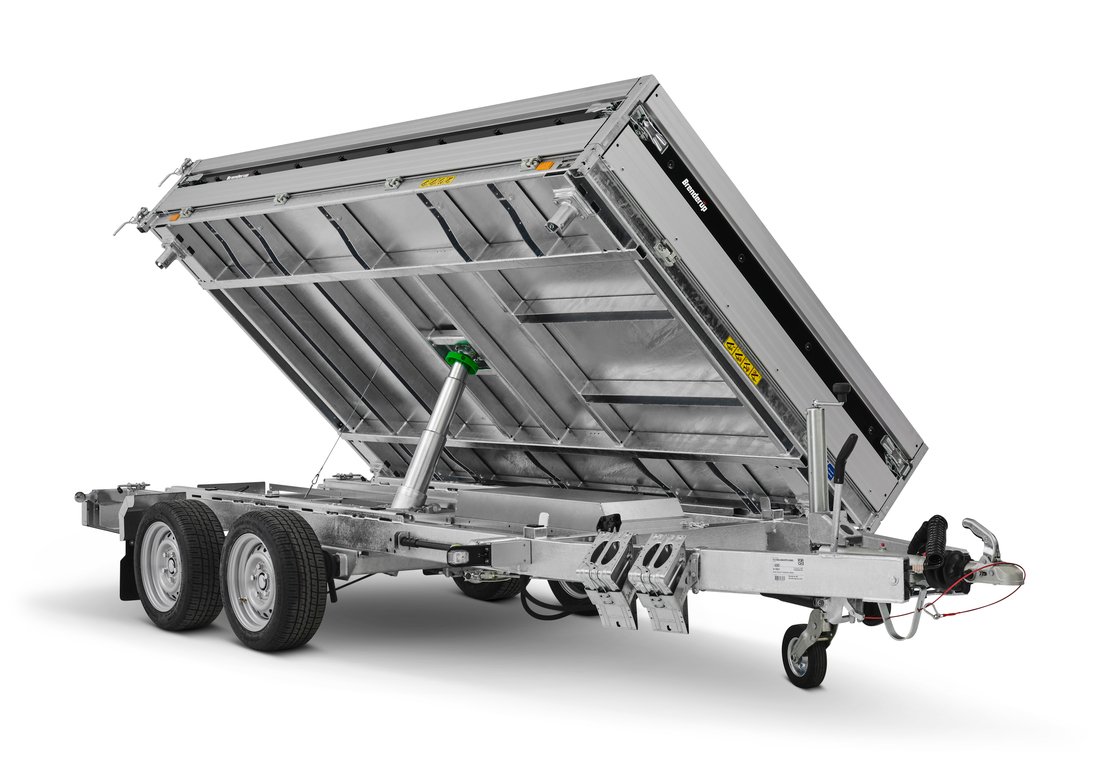 Dieser gebremste Dreiseitenkipper ist für professionelle Einsätze konzipiert, bei denen der häufige Transport und das Entladen schwerer Lasten erforderlich sind. Die Konstruktion legt Wert auf ein ausgewogenes Verhältnis zwischen Nutzlast und Wendigkeit, mit einer für Baustelleneinsätze geeigneten Ladehöhe. Das unterstützte Kippsystem erleichtert die Entladevorgänge, während die Gesamtkonstruktion auf einen vielseitigen Einsatz für Schüttgüter oder Ausrüstungen ausgelegt ist. Der Wabenboden trägt zur Reduzierung des Leergewichts bei und bietet gleichzeitig eine ausreichende Steifigkeit für den regelmäßigen Einsatz in anspruchsvollen Umgebungen.