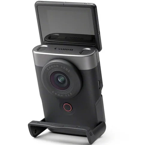 Die Canon PowerShot V10 Silver ist eine kompakte Kamera für Vlogging, ausgestattet mit einem Weitwinkelobjektiv entsprechend 19 mm mit Blende f/2.8 und konzipiert für 4K-Videoaufnahmen in einem leichten und autonomen Format für die Erstellung von Foto- und Videoinhalten.