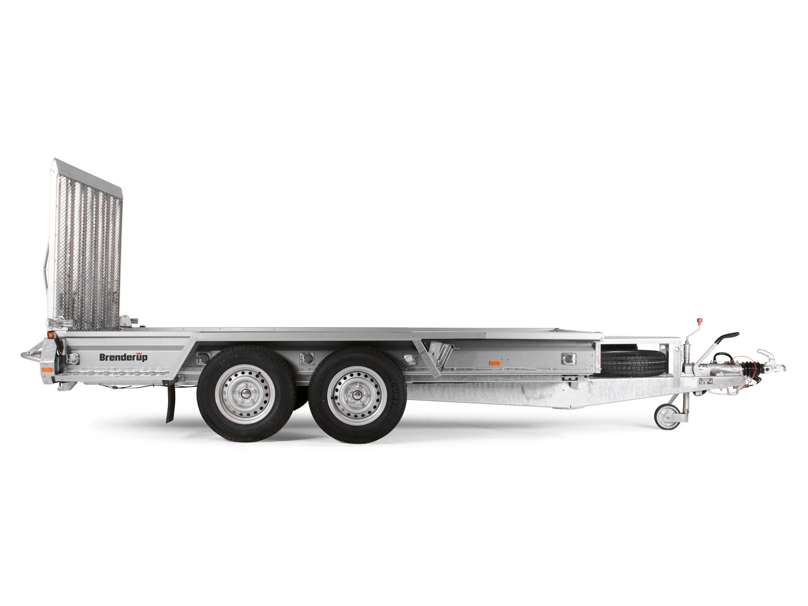 Baumaschinentransporter Brenderup MT 3651 STB 3500, konzipiert für den Transport von großen Maschinen und Baustellengeräten. Dieser gebremste Tandemanhänger in Stahlbauweise verfügt über eine sehr große Ladefläche, die den Transport von Minibaggern und voluminösen Maschinen ermöglicht. Er bietet eine Nutzlast von 2.720 kg bei einem zulässigen Gesamtgewicht von 3.500 kg und einem Leergewicht von 780 kg. Das Beladen wird durch eine Heckrampe mit integriertem Halter sowie durch einen Auffahrwinkel von 20° erleichtert. Die Ladehöhe von ca. 500 mm und die begehbaren Kotflügel ermöglichen funktionale Auf- und Abfahrvorgänge.