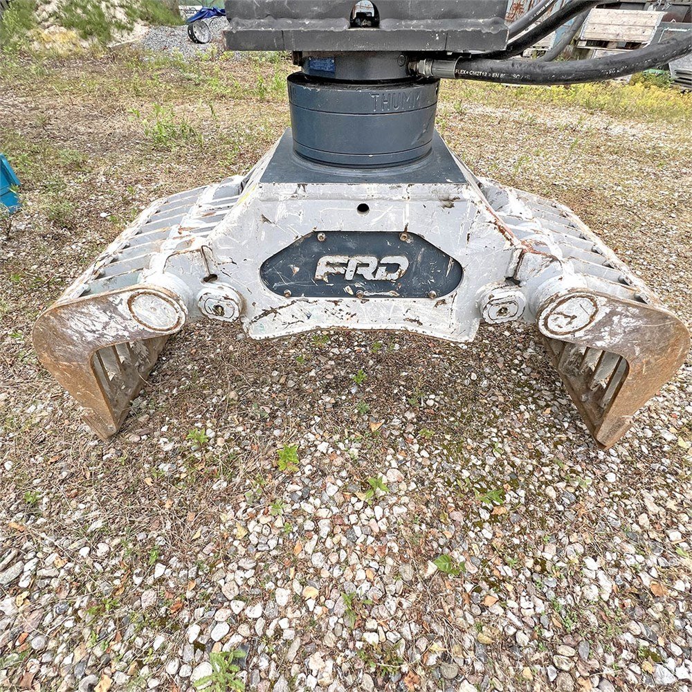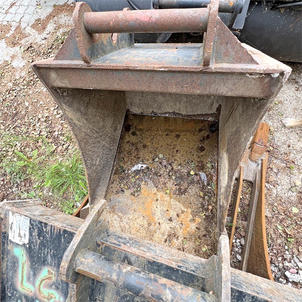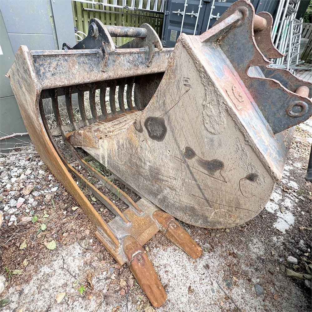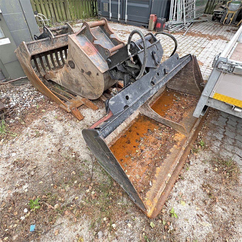 einem hydraulischen Schnellwechsler FL45, einem Neigelöffel 180 cm, einem Sortiergreifer