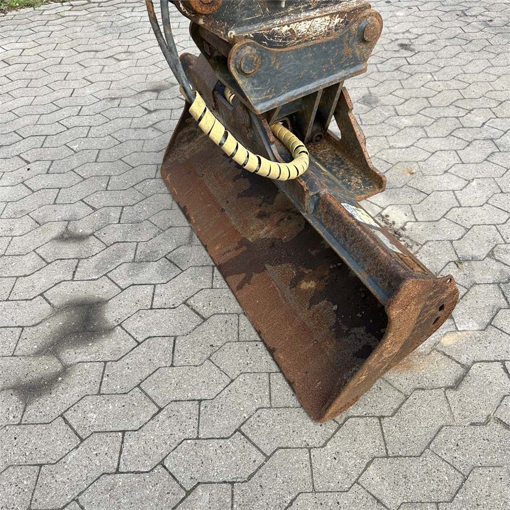 und geliefert mit drei Löffeln, darunter ein hydraulisch schwenkbarer 120-cm-Löffel.