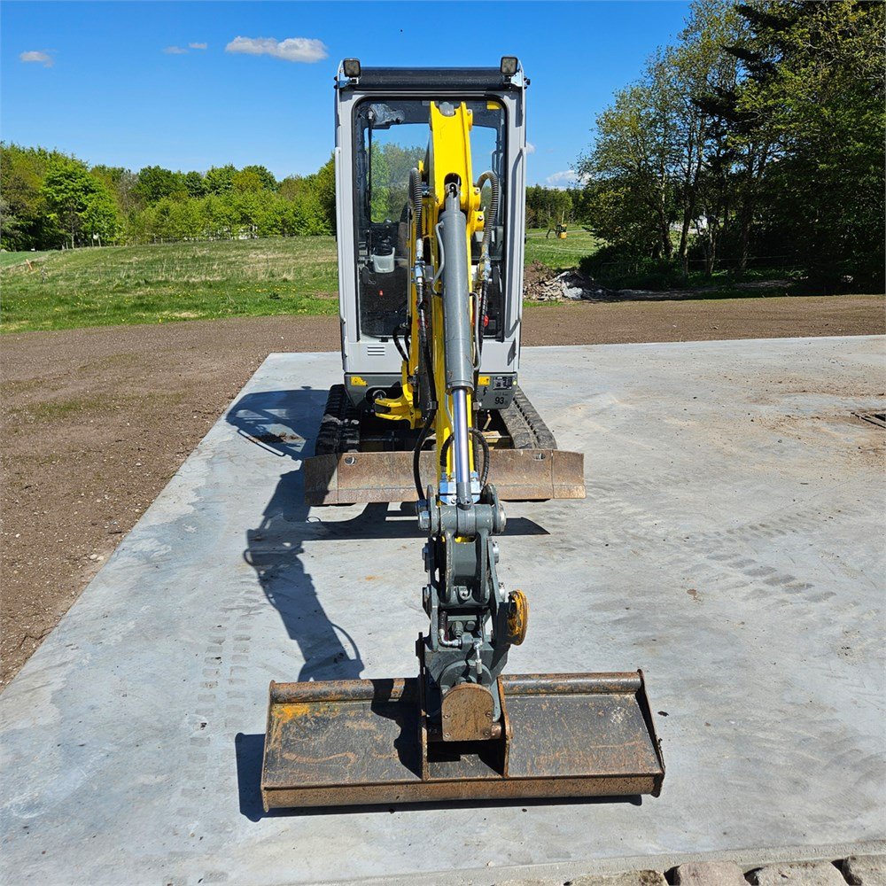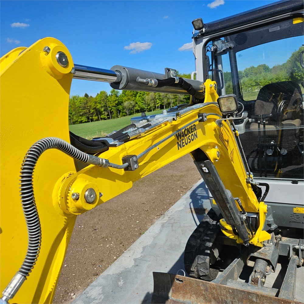 Mini-Bagger Wacker Neuson ET18 aus dem Jahr 2021, kompakte Maschine mit ca. 2,2 Tonnen, ausgelegt für Erdarbeiten, Leitungsbau und Gestaltungsarbeiten in beengten Bereichen. Er weist ca. 452 Betriebsstunden auf und ist mit einem Yanmar-3TNV76-Dieselmotor mit 13,8 kW ausgestattet. Dieser Mini-Bagger verfügt über einen Monoboom, einen Helac-Powertilt mit hydraulischer Schnellwechseleinrichtung S40 unter dem Tilt sowie über mehrere Löffel, die einen vielseitigen Einsatz auf der Baustelle ermöglichen. Auf Gummiketten montiert und CE-konform, wurde er einer Sichtprüfung unterzogen. Die wichtigsten mechanischen Komponenten werden als funktionsfähig angegeben. Der optische und technische Zustand wird mit 4 von 5 bewertet, und die Maschine kann bis zur Lieferung in Betrieb bleiben.